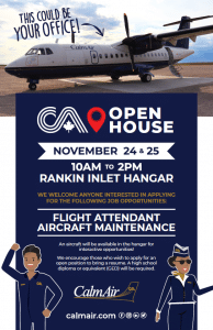 Calm Air will be hosting an open house at the Rankin Inlet hangar on two dates, November 24 and 25 from 10 AM to 2 PM and then on December 7 and 8 from 10 AM to 2 PM. Come find out and learn more about the positions that calm air is recruiting for.