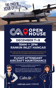 Calm Air will be hosting an open house at the Rankin Inlet hangar on two dates, November 24 and 25 from 10 AM to 2 PM and then on December 7 and 8 from 10 AM to 2 PM. Come find out and learn more about the positions that calm air is recruiting for.