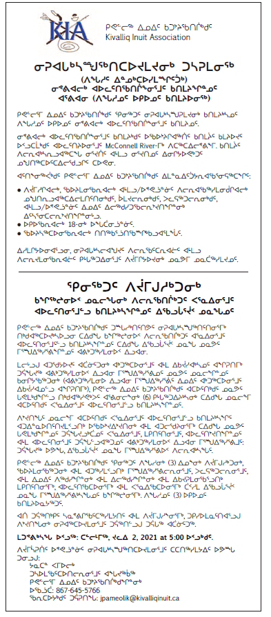 The deadline is fast approaching to submit your name and resume to the CJCMP! Deadline is August 13, 2021 CJPMC Inuktitut Iqalugaarjuup Nunanga CJPMC English Iqalugaarjuup Nunanga